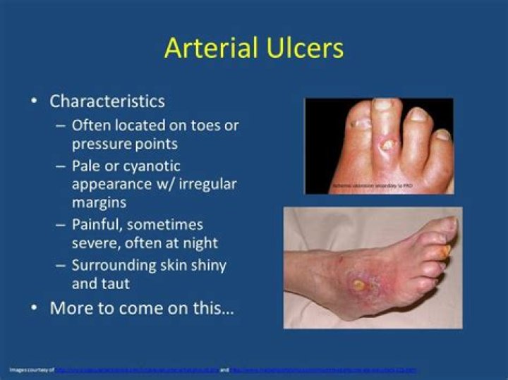 Arterial ulcers are often very painful, they are often on the foot, around the ankle, sometimes the lower leg. The pain from them can be worse at night, and patients hang the leg out of bed or sleep in a chair to get relief from this night pain.