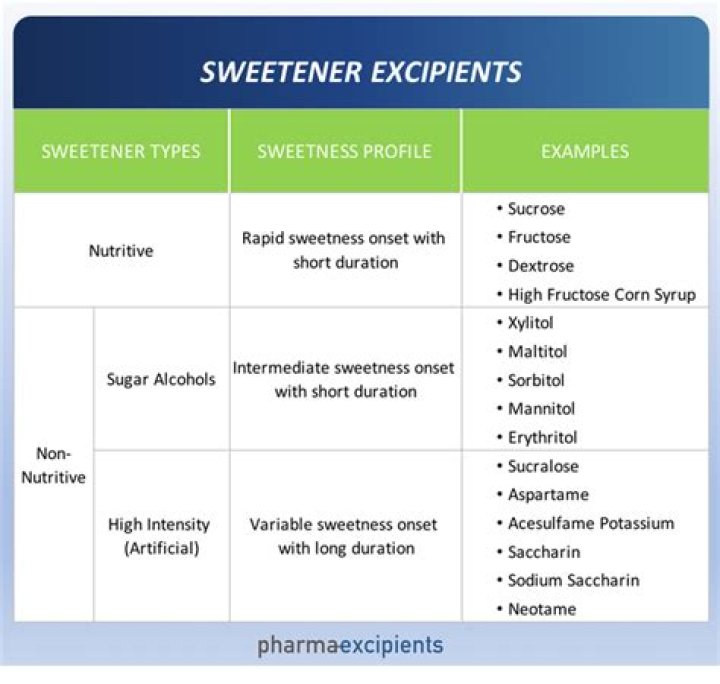 Sweetening agents are excipients often added to pharmaceutical dosage forms to mask bitter taste of the partially dissolved drug and to improve palatability in general. Traditionally, oral formulations were sweetened using concentrated sucrose solution (syrup) or honey (contains fructose).
