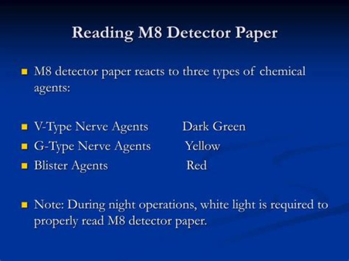 TECHNICAL DESCRIPTION: M8 paper is a chemically-treated, dye-impregnated paper used to detect liquid substances for the presence of V- and G-type nerve agents and H- and L-type blister agents. These papers contain three soluble dyes integrated into cellulose fiber strips.